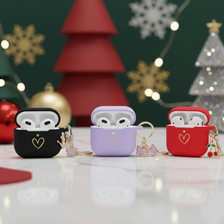 Elevate your AirPods 3 with this stylish soft silicone case featuring a chic gold heart pattern and an adorable butterfly keychain, perfect for girls and women who love trendy accessories.